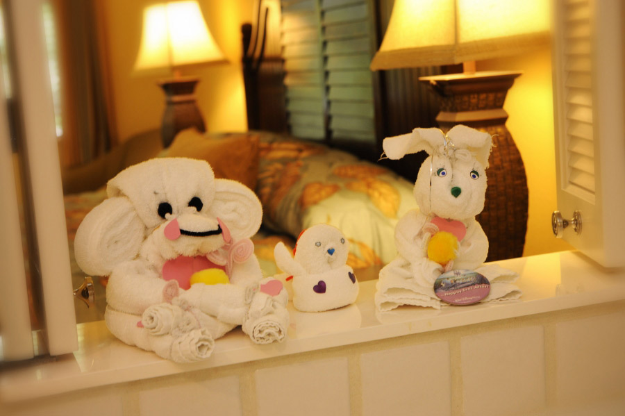 And I personally think they nailed it with the bedding. The warm colors are very elegant while still capturing the playful nature of Key West. The villas also have fancy new granite countertops, pretty new light fixtures and of course flat screen TVs. The housekeeping staff sure has fun creating the towel animals placed throughout the villas. Check out the images shot this week.